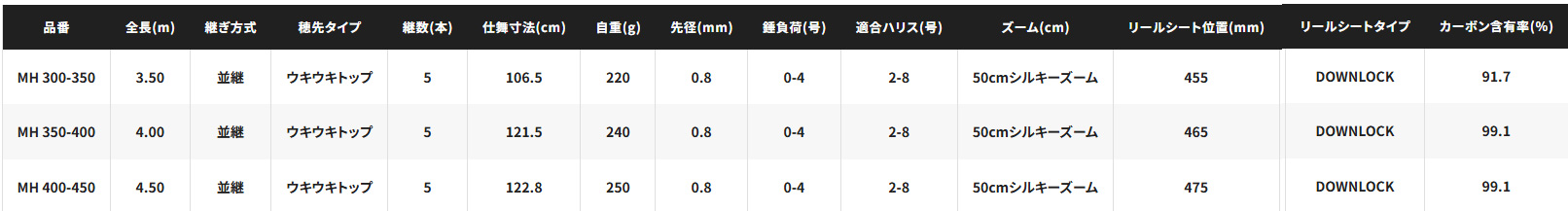 シリーズで最も長いレングス設定。4mは多くの海上釣堀で置き竿釣法やイケス中央部の攻略に活躍。ズームアップした4.5mは釣堀のレギュレーションに注意が必要ではあるが、最長レングスで今までは攻略不可能であったエリアまでツケエサをアプローチ可能に。未開のポイント開拓が釣果に差を付ける。