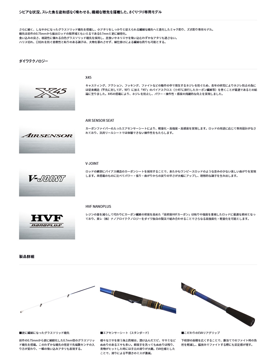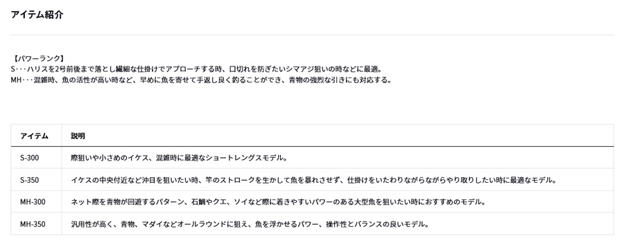 | ■製品スペック | | アイテム | 全長(m) | 継数 | 仕舞寸法(cm) | 標準自重(g) | 先径/元径(mm) | 錘負荷(号) | 適合ハリス ナイロン(号) | カーボン含有率(%) | | S-300 | 3.0 | 4 | 89 | 150 | 0.7/16.8 | 0.5-8 | 1-6 | 75 | | S-350 | 3.5 | 4 | 103 | 160 | 0.7/16.8 | 0.5-8 | 1-6 | 74 | | MH-300 | 3.0 | 4 | 89 | 168 | 0.7/16.8 | 0.5-12 | 2-8 | 68 | | MH-350 | 3.5 | 4 | 103 | 188 | 0.7/16.8 | 0.5-12 | 2-8 | 69 |