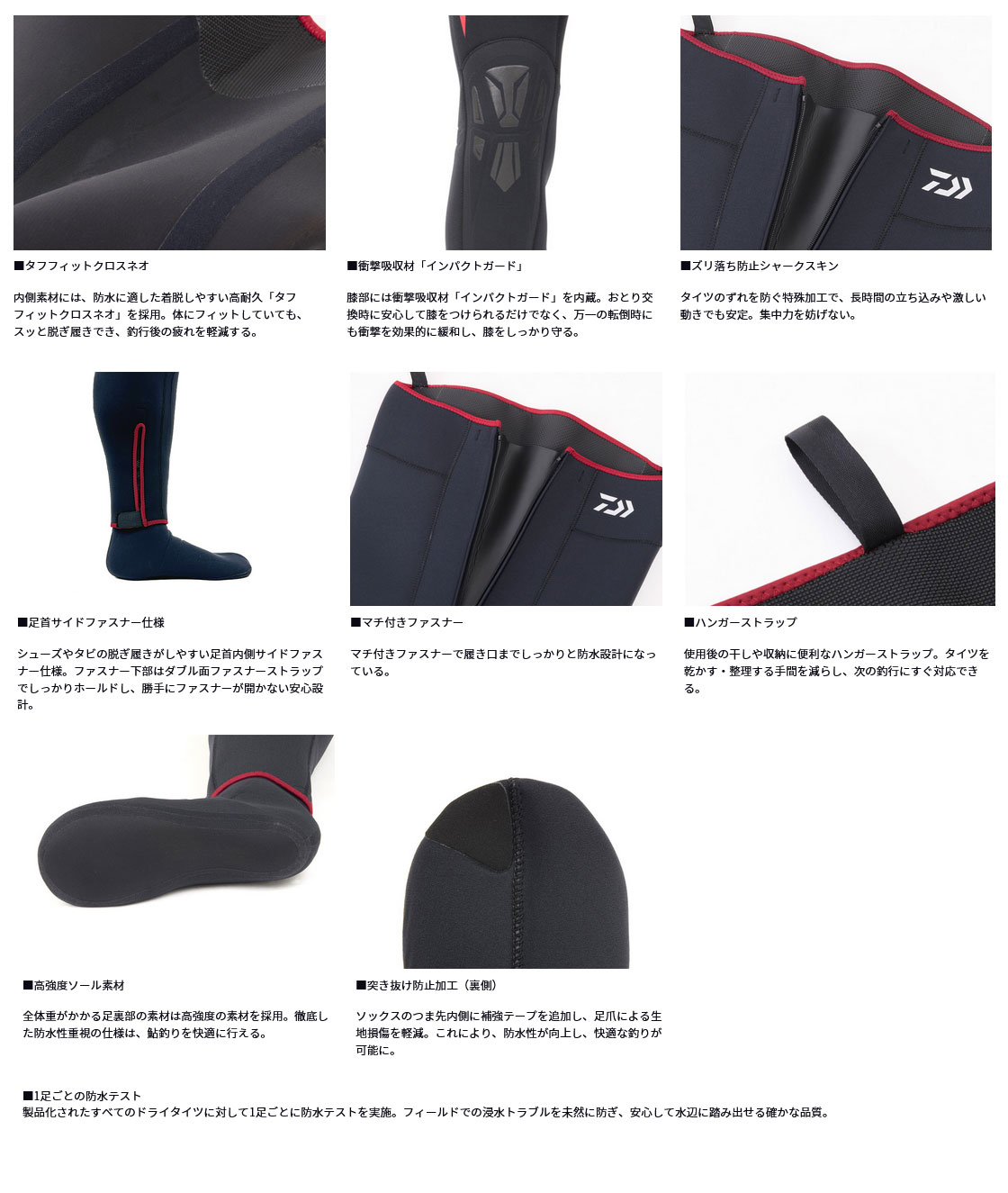 特殊加工のシャークスキンがタイツのズレを防ぎ、長時間の立ち込みでも集中力をキープ。