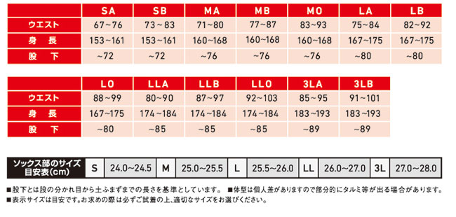 サイズ目安表(単位:cm)
