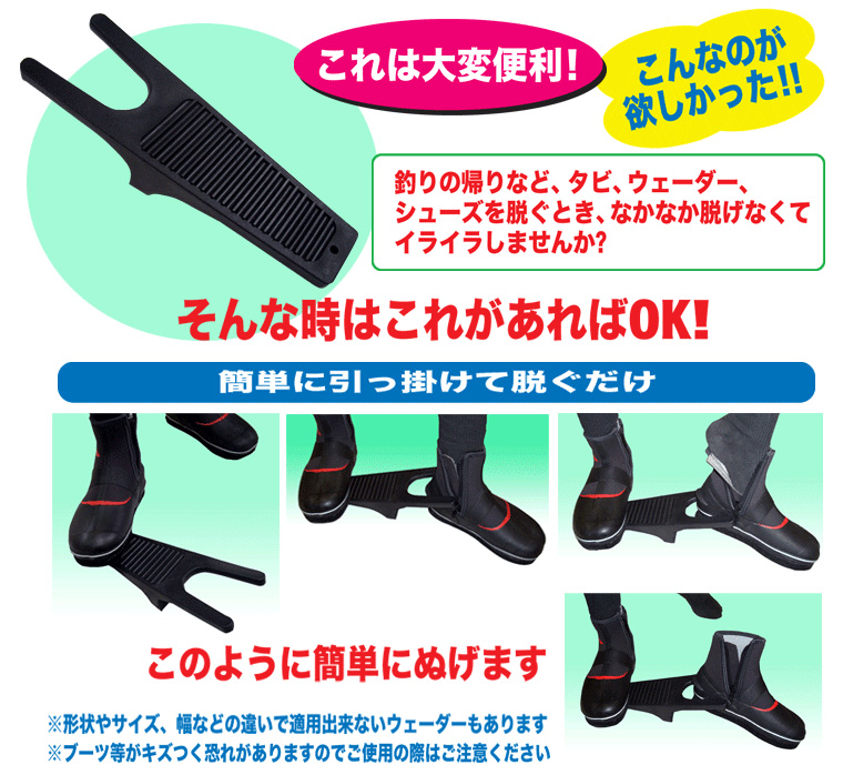 脱ぎにくいウェーダー、タビ、シューズ、ブーツまで、手を使わず簡単に脱ぐ事が出来ます。