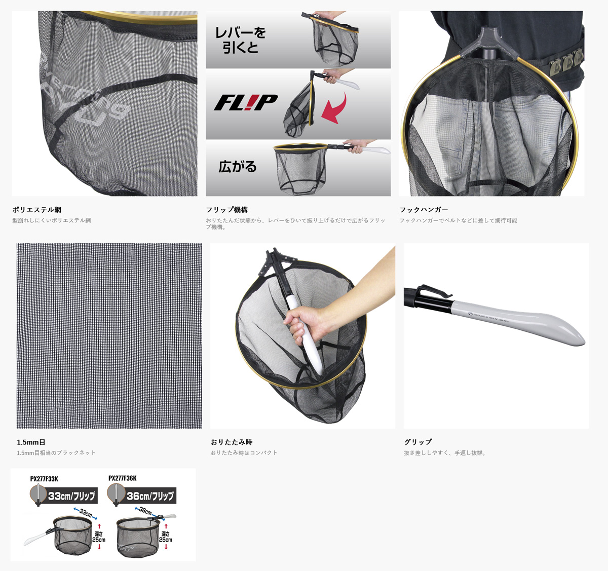 【プロックス|タモ|鮎タモ|鮎釣り】| リバーリングフリップアユダモ |  | | 柄が折りたためる鮎だも | ルアーを使ってアユを狙うリバーリングアユにも対応するオールラウンダーな鮎だも。 柄をコンパクトにおりたたんだ状態から、レバーをひいて振り上げるだけでランディング仕様に開くことが可能。 レバーは、フックハンガー形状のため、ベルトなどに差して携行可能。 ネットは、張りがあり、型崩れしにくい約1.5mm目ポリエステル網。 抜き差ししやすいグリップ形状。 アユ釣り全般に適した鮎だも。