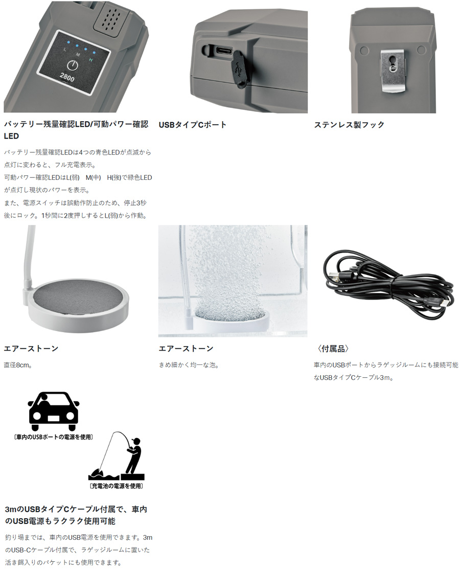 ●繰り返し使えるリチウム充電式エアーポンプ。 ●バッグ内等での不意の誤作動による充電池の消耗を防ぐロック機能(ダブルクリックで作動)。 ●あらゆる方向からの強い噴流水にさらされても本体に浸水しない程度の防水IPX6。 ●バッテリー残量確認LEDと可動パワー確認LED。 ●きめ細かく均一な泡の直径8cmエアーストーン。 ●折れにくく空気の通りをしっかりと確保するP.V.Cエアーホース80cm付。 ●車内のUSBポートからラゲッジルームにも接続可能なUSBタイプCケーブル3m付。