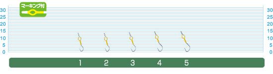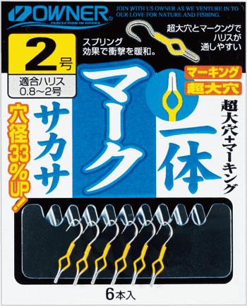 超大穴ハリス留めとマーキングによってハリスが非常に通しやすい。 また、ハリス止接合部にもマーキングを施し、 サカサの状況が一目でわかる! ハリス止には平線ステンレスワイヤーを使用し、 負荷がハリスの一点に集中せず、ハリスが切れにくい 。 鈎は刺しやすく、外れにくい速攻サカサを使用し、 手返しも抜群です。 |