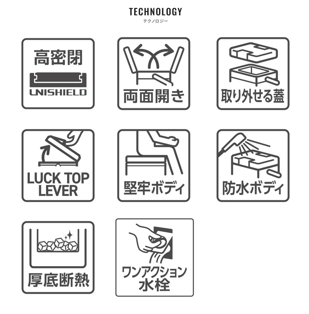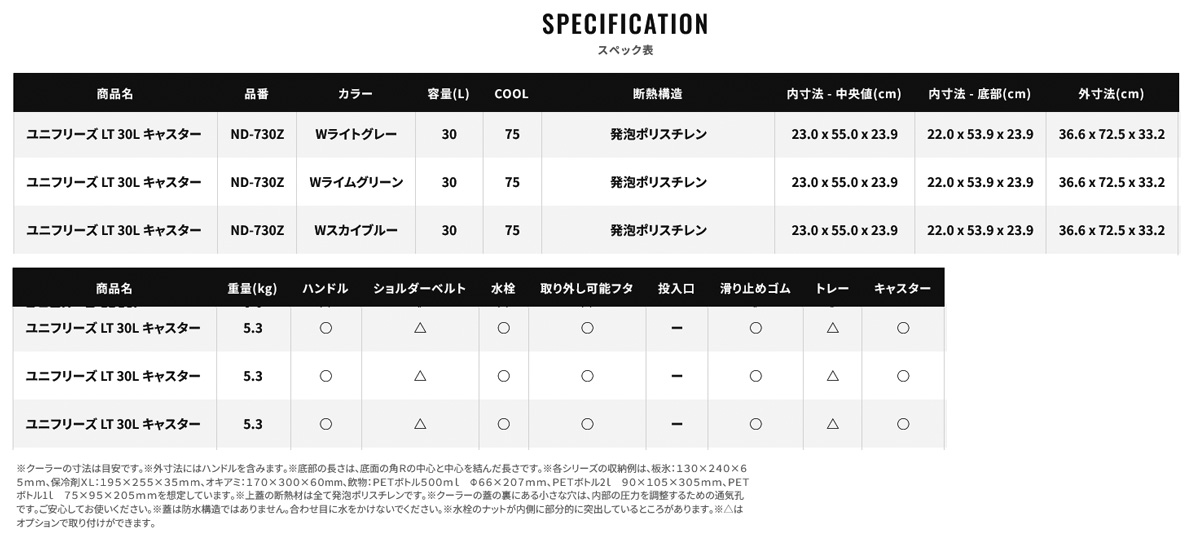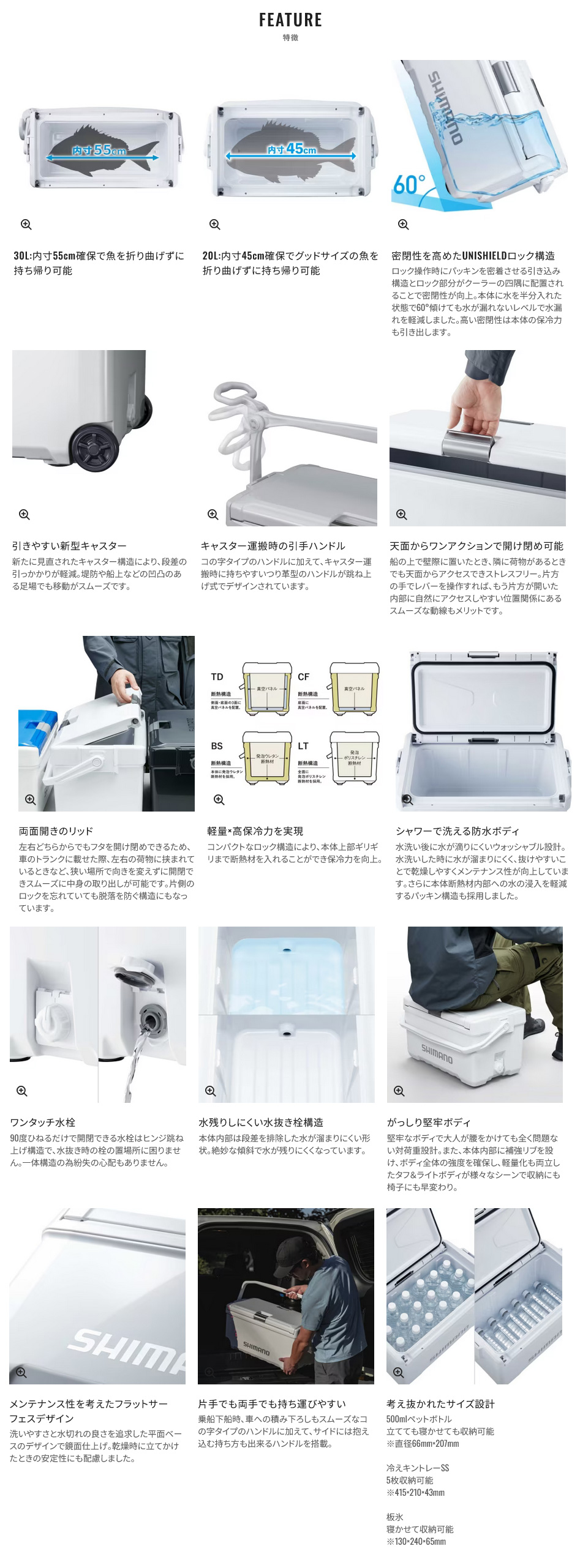 【シマノ|クーラー|ユニフリーズ|30L】| ユニフリーズ LT 30L キャスター ND-730Z |  | | | 魚を持ち帰ることを考えた新定番の釣り用クーラーボックスです。20Lは内寸45cmを確保、グッドサイズの魚を折り曲げずに持ち帰ることができます。30Lは内寸55cmを確保し、尺超えの魚も折り曲げずにそのまま収納でき、キャスター付きで移動もスムーズ。独自構造「UNISHIELD」により密閉性が高く、水漏れや冷気漏れを抑えやすくなっています。両面開きの蓋は、車内や船上の限られたスペースでも開閉しやすく、ワンタッチで開く跳ね上げ式水栓は使用後の水抜きも快適。底部に水が残りにくく、洗いやすさにも配慮されています。堤防釣りからインショアボート、船エサ釣りまで幅広く対応する、頼れるクーラーボックスです。 |