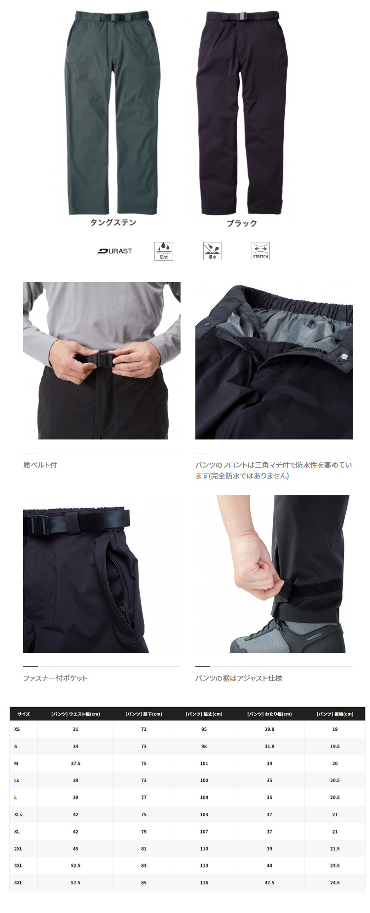 ●防水、透湿、撥水かつ擦れに強い耐摩耗 ●生地のばたつきを抑えるスリムシルエット