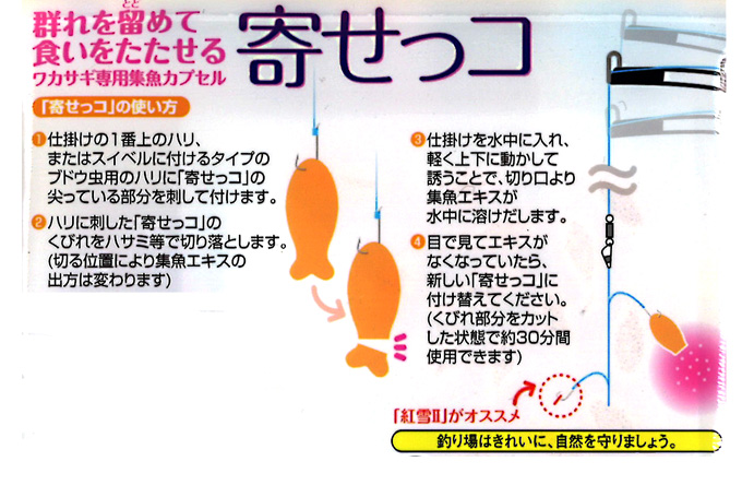 | 魚の形をしたカプセルにワカサギの好むエキスを濃縮。仕掛けの一番上のハリなどに付け、くびれ部分をカットして使用。そ