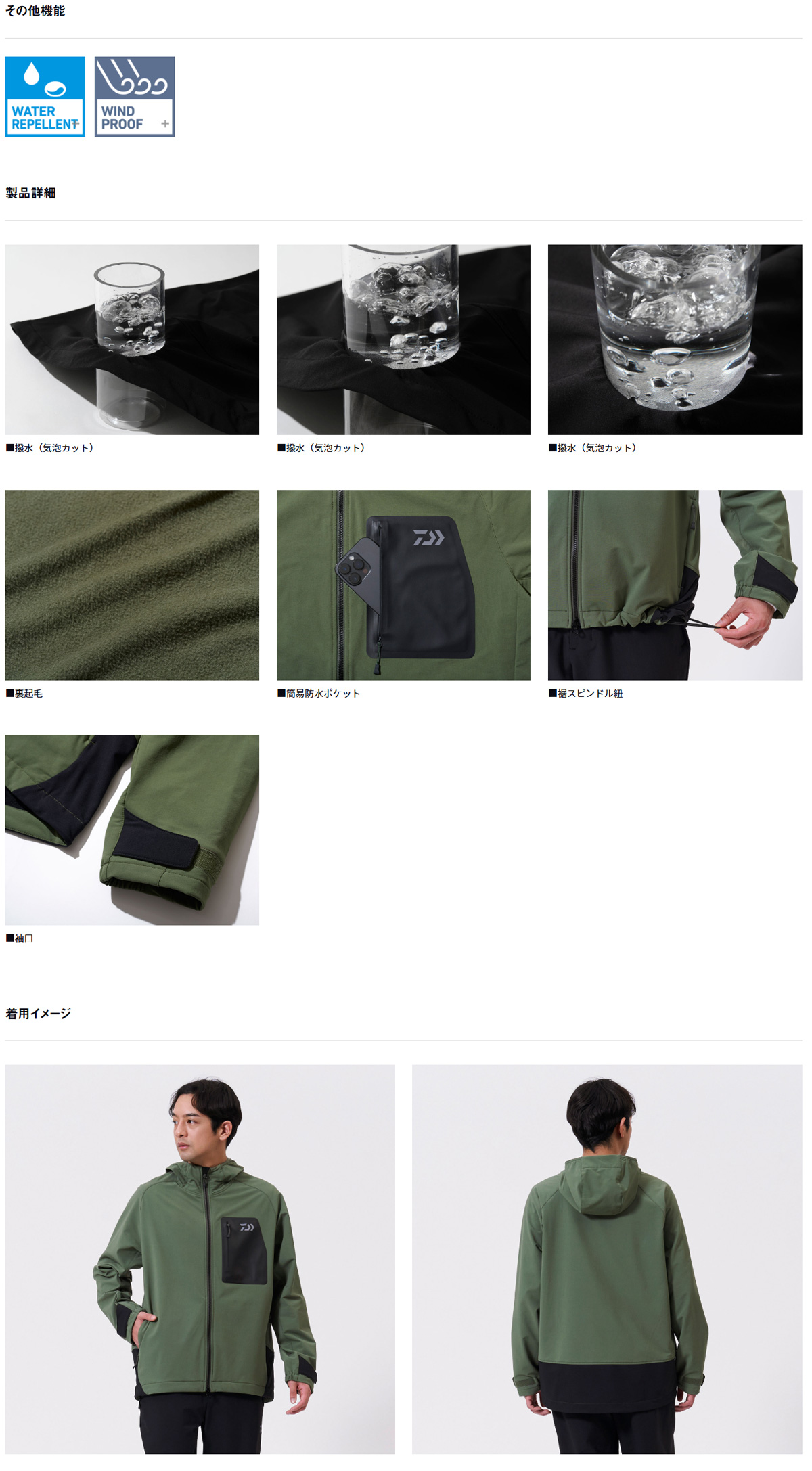 【ダイワ|防寒|撥水機能|保温性】DJ-9325 STORMFLEECE™ウィンドブロックジャケット  | あらゆるシーンで活躍する高機能ソフトシェルジャケット 裏表で異なる機能を併せ持つ機能素材STORMFLEECE™を採用。 表側は織物の強度と撥水機能をもち、かつ裏は起毛素材で保温性も併せ持つ。 異素材同士を1枚生地で表現するために、フィルムや接着材を介さない接結の製法を採用することで製品の軽量化を実現。 レインウェアを着用しない際も安心の撥水性があり、水しぶきや多少の雨、道具を洗うシーンにも便利。 更に、ストレッチ性に優れた素材でもあり、レイヤリングしたときにも突っ張りにくい。 胸にはセーフティポケットを設け、濡れた手で操作してもしみ込みにくいように設計。 洗濯で繊維が抜けにくいフリースを採用することで、長持ちでヘタりにくく、環境にも優しい。 裾とフードは冷気を防ぐため、バインダー仕様。脇には小物の収納に便利なファスナー付きポケットを採用。 |  | 素材 本体:ナイロン61% ポリエステル29% ポリウレタン10% 部分:ポリエステル100% |