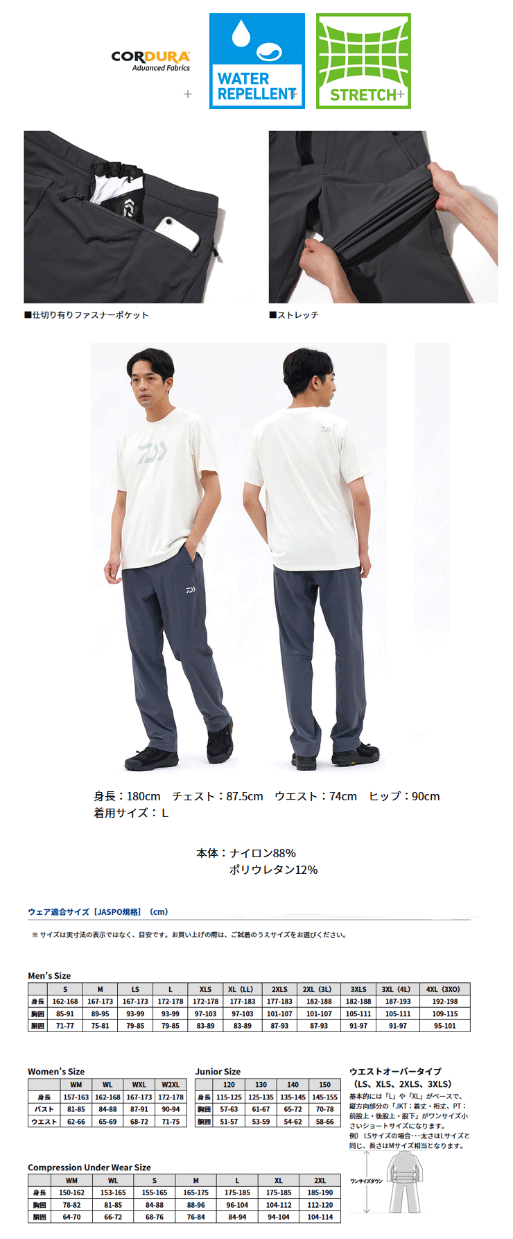 本体は摩耗に強いCORDURA®素材を採用。撥水、ストレッチ機能付き。 右後ろのファスナー付きポケットは仕切りがあり、携帯や小物の仕分けにも便利。仕切りの脇側ポケットは携帯電話等を入れ座った際に踏まないように設計。