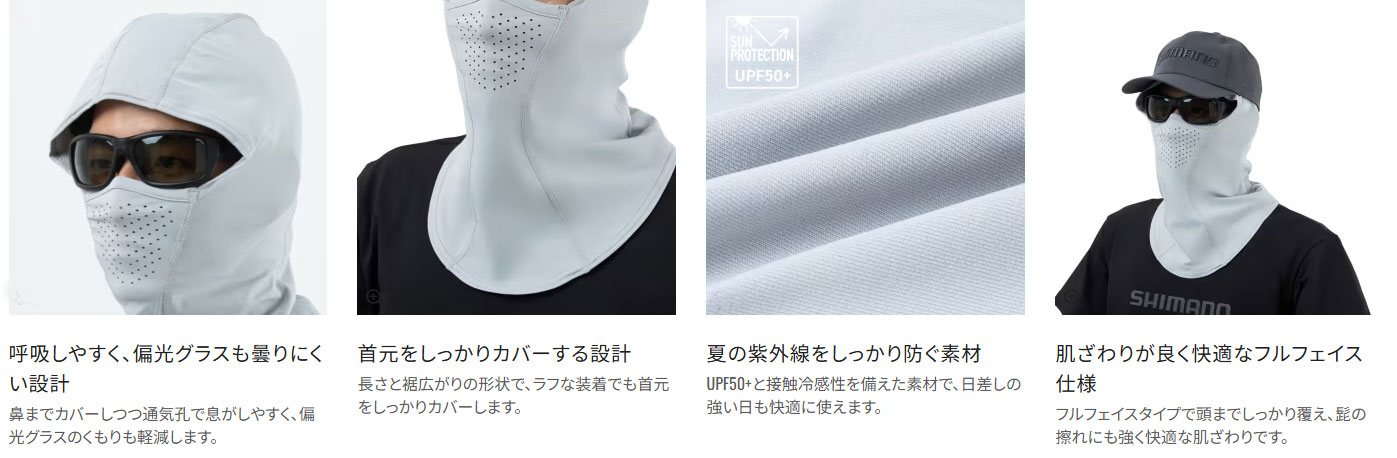 【シマノ|フルフェイス|ネックカバー】フルフェイスマスク AC-000Z  | しっかり日焼けを防ぐフルフェイスタイプ 着けごこちにもこだわりを 日差しの強い中でも、できるだけ肌を露出せずに釣りを楽しみたいアングラーに向けた、フルフェイスタイプのネックカバー。耳や鼻、首まわりまでしっかりカバーできる形状で、高い紫外線対策効果を発揮します。長時間の着用を考慮し、フィット感や通気性、呼吸のしやすさにも配慮。肌に直接触れるアイテムだからこそ、快適性を追求した設計です。日焼け対策と快適な釣行を両立したい方におすすめです。