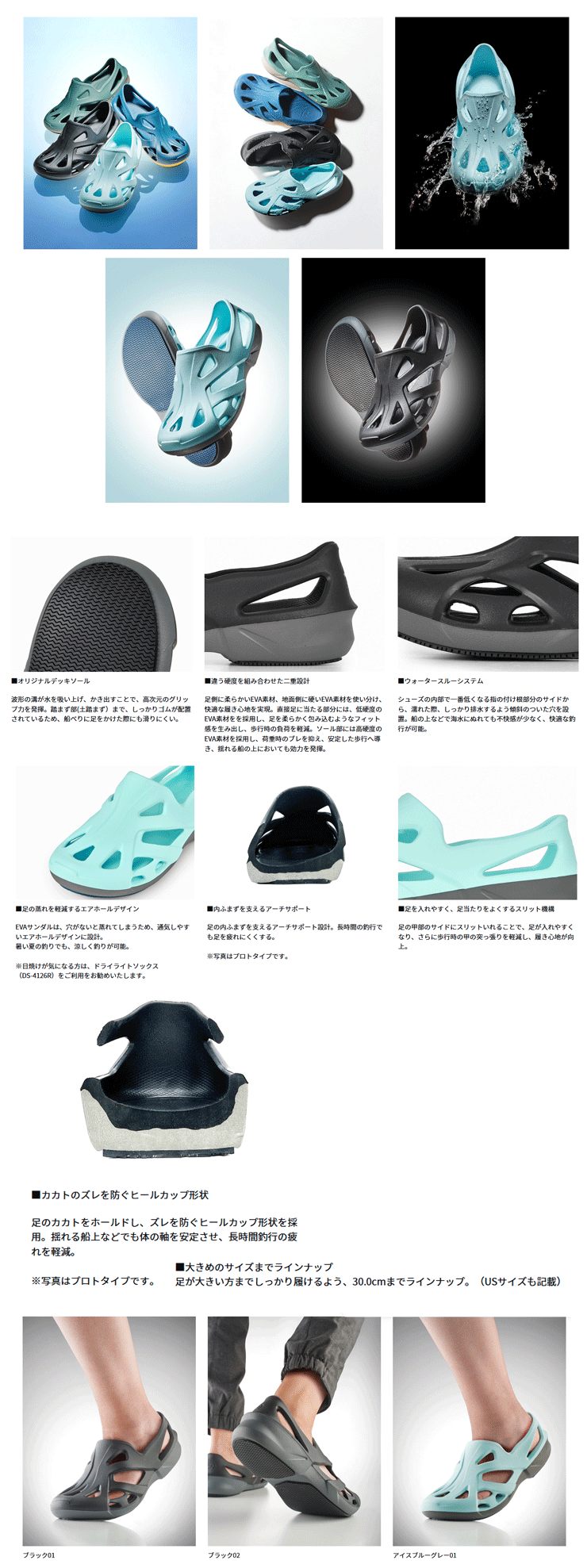 ソール部には高硬度のEVA素材を採用し、荷重時のブレを抑え、安定した歩行へ導き、揺れる船の上において、効力を発揮する。