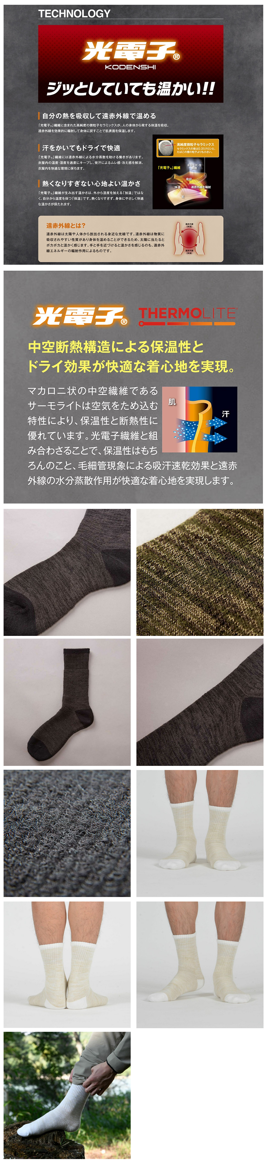 【フリーノット|靴下|ソックス|防寒】| 光電子 レイヤーテックミドルソックス 先丸 Y5140 | | つま先、かかとは糸を増やすことで、保温性、強度をアップ。 |  | ●光電子®とは、特殊セラミックスの働きで、人の身体から発する遠赤外線のエネルギーを利用し体の芯まで温める。様々な素材と組み合わせることで、より効果的な保温効果が得られる。また、汗など水分の蒸散性、速乾性を向上させる特徴もある。 ●マカロニ状の中空繊維構造による保温性とドライ効果が快適な着心地を実現する「THERMOLITE®」を採用。 ●先丸ミドル丈モデル。 ●つま先、かかとは糸を増やすことで、保温性、強度をアップ。 ●サポートゴム入りでズレを防止。 ●裏パイル仕様。※踝(くるぶし)から上はパイルにしないことで、ズレ落ちを軽減。 ●抗菌防臭糸を使用
