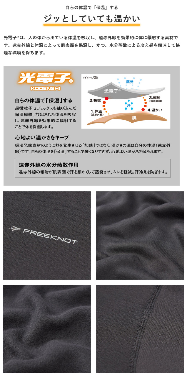 【フリーノット|タイツ|防寒|超厚手】| 光電子 レイヤーテック アンダータイツ 超厚手(レディース)Y5619W |  | ■心地よい温かさをキープ 光電子®は、独自の高純度微粒子セラミックスを繊維に練り込むことで、人体が発する遠赤外線(体温由来)を吸収・輻射し、体を芯から温める素材です。発熱するわけではなく、自身の体温を効率よく利用する“自然な温かさ”が特徴。洗濯による効果の低下も少なく、長く使っても性能が維持されます。