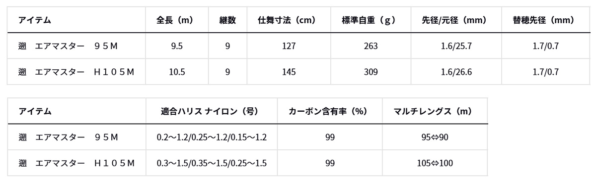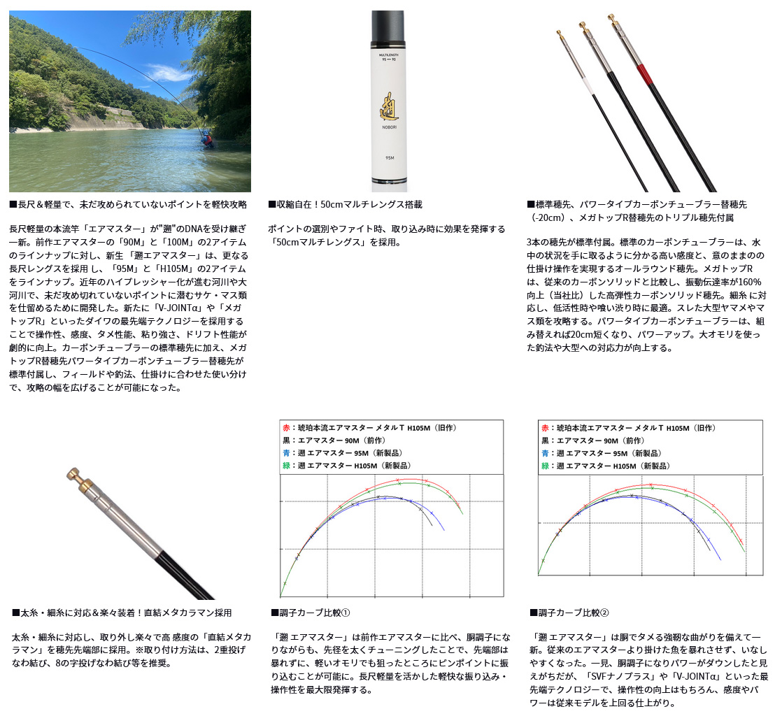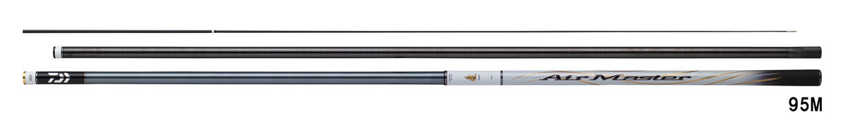 長尺レングスで未踏の領域を攻める軽量本流竿、新生「エアマスター」誕生。 | 長尺軽量本流竿「エアマスター」が“遡”のDNAを受け継ぎ一新。「V-JOINTα」を採用することで操作性、タメ性能、粘り強さが劇的に向上。今まで届かなかったポイントに正確に振り込めるようになり、意のままの仕掛け操作やドリフトコントロールを実現。また、中節には「エアグロスフィニッシュ」を採用し、塗装による持ち重りや感度の低下を極限まで抑えている。河川、仕掛け、サイズに幅広く対応するチューブラーの標準穂先に加え、柔軟性に優れ、より細糸に対応し、低活性時やスレた状況に最適な「メガトップR」の替穂先が標準付属。更に急流や大型狙いに20cm短いパワータイプカーボンチューブラー替穂先も標準付属。標準付属の3本の穂先でフィールドに適したセッティングが可能となり、大型ヤマメやマス類を軽快且つパワフルに仕留める。P-2相当の95M、P-2.7相当のH105Mをラインナップし、未踏の領域に潜む大型ヤマメやマス類狙いには欠かせない一竿。